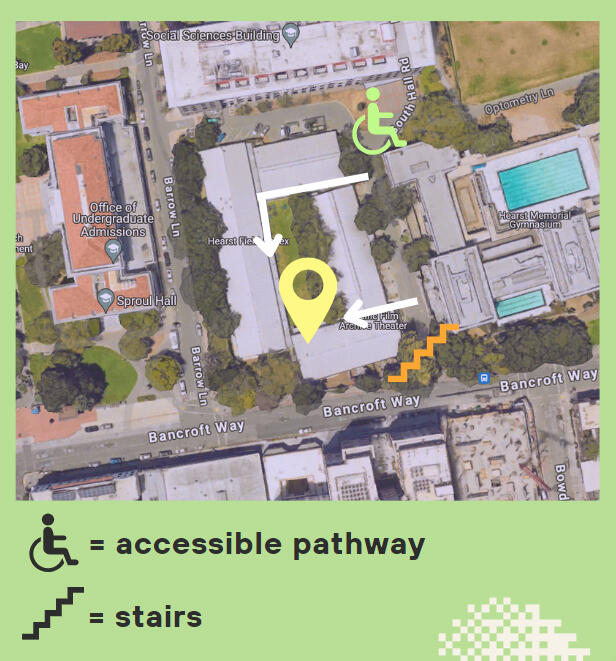 Find us on Google Maps here for general directions. Please refer to the diagram above for more detailed instructions on how to find the entrance to the space.For ADA accessible walkways, approach the Hearst Field Annex (HFA) complex from the north near the social sciences building and turn to the right into either one of the paths indicated by the white arrows.For the stairs, approach HFA from the south and climb up several steps from Bancroft Way heading north, keeping the Hearst Gymnasium on your right (not to be confused with the Hearst Field Annex). Just past the auditorium on your left labeled Building A is a path indicated by the white arrow on the bottom.Both routes lead to the front door of QARC, where you can ring the doorbell to be let in!Here's what we look like from the outside :O